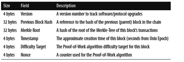 بخش header متشکل از 6 داده است. اولین بخش header شماره ورژن بلوک است که در همه بلوکها مقدار آن ثابت است. دومین داده هش قسمت header بلوک قبلی در زنجیره بلوکها است. این هش مشخصه اصلی بلوک قبلی است و ارتباط بلوکها را با یکدیگر میسر میکند. سومین داده ریشه درخت مرکل است. منظور از درخت ساختار داده خاصی است که به گراف درخت شباهت دارد. در این ساختار برگها، هشهای تراکنشها هستند و دو به دو از آنها هش گرفته میشود.(دو هش تراکنش در کنار یکدیگر گذاشته میشود و از آن هش گرفته میشود. H(AB)=H(A|B)) در لایه بعدی دوباره همین کار روی هشهای به دست آمده از لایه قبلی تکرار میشود تا به یک هش نهایی برسیم. اگر در لایه ای تعداد هشها فرد بود، آخرین هش را یکبار کپی میکنیم تا تعداد زوج شود. برای مثال اگر پنج تراکنش داشته باشیم و بخواهیم ریشه درخت مرکل آنها را به دست آوریم و تراکنشها به ترتیب A,B,C,D,E باشد و H تابع هش باشد، داریم: