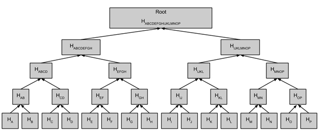 بدین صورت ریشه درخت در واقع خلاصه شده همه تراکنشها است. علت برگزیدن ساختار درخت برای این کار امکانی است که این ساختار برای چک کردن حضور یک تراکنش در یک بلوک در اختیار ما قرار میدهد. اهمیت یک سیستم با توان پردازشی یا حافظه کم مشخص میشود. به نحوی که بدون اینکه نیاز به ذخیره کردن همه بلوک وجود داشته باشد، با استفاده از header بلوک و تراکنش و چند هش وجود تراکنش در بلوک را بررسی کرد. مثلا در شکل بالا اگر بخواهیم وجود A در بلوک را بررسی کنیم صرفا به HB و HCD و HEFGH و HIJKLMNOP نیاز است. به عبارت دیگر با این روش مقدار حافظه و پردازش برای چک کردن بلوک، با افزایش اندازه بلوک به صورت لگاریتمی و به آهستگی رشد میکند.