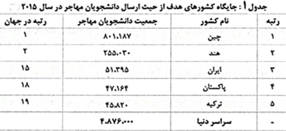 در این گزارش تلاش شده است تا با بررسی تعداد دانشجویان مهاجر ایرانی در دنیا و به خصوص در دانشگاه های برتر دنیا در سال های گذشته و نیز تعداد اساتید ایرانی در میان اعضای هیات علمی دانشگاه های برتر دنیا، جایگاه ایران و نخبگان ایرانی در توسعه علم و فناوری در دنیا و نیز در بین کشورهای آسیایی نظیر چین، هند، ترکیه و پاکستان سنجیده شود. هدف اصلی این گزارش ایجاد یک شناخت واقعی از اهمیت و جایگاه کشور در علم و فناوری جهان است. به گزارش موسسه آمار یونسکو از مجموع حدود ۵ میلیون دانشجوی مهاجر در دنیا در سال ۲۰۱۵، چین با فرستادن بیش از ۸۰۰ هزار دانشجوی مهاجر به سراسر دنیا در جایگاه نخست و سپس هند با حدود ۲۵۵ هزار دانشجوی مهاجر در جایگاه دوم قرار دارد. ایران، پاکستان و ترکیه با آماری نزدیک به همدیگر به ترتیب در رتبه های ۱۵، ۱۸ و ۱۹ جهان قرار گرفته اند. (جدول 1)