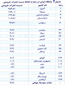 ایران با نسبت تحرک خروجی ۱/۱ درصد (کمتر از مقدار متوسط جهانی ۲/۱٪)، در رده ۱۰۷ این جدول و بعد از سوئد، آلمان، فرانسه و …. در کنار کشورهایی چون مصر، ژاپن و استرالیا و پایین تر از کشورهایی نظیر سوئیس، قرار دارد.