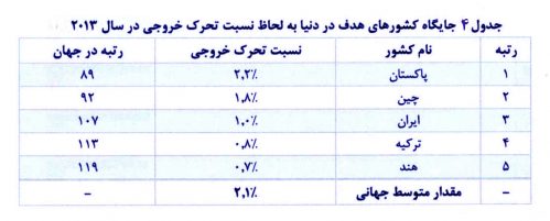 همچنین در میان کشورهای هدف (ایران، پاکستان، ترکیه، چین و هند) پاکستان با نسبت تحرک ۲/۲٪ (بالاتر از متوسط جهانی) در رتبه ی ۸۹ جهان قرار دارد. بعد از پاکستان، چین با نسبت تحرک خروجی ۱/۸٪ در رتبه ۹۲، ایران با مقدار ۱/۱٪ در رده ی ۱۰۷، ترکیه با ۰/۸٪ در رده ی ۱۱۳ و هند با مقدار ۰/۷٪ در جایگاه ۱۱۹ قرار دارند. (جدول 4)