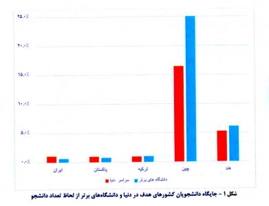 بر اساس آمارهای اعلام شده از دانشگاه های برتر دنیا، سهم دانشجویان چینی در دانشگاه های برتر دنیا ۹/۲۶ درصد برآورد می شود. بعد از چین دانشجویان هندی ۶/۲٪ از کل دانشجویان این دانشگاه ها را تشکیل داده اند. ترکیه با ۱٪ و پاکستان با ۸/۰ درصد در جایگاه های بعدی قرار دارند. ایران در سال گذشته تنها حدود ۵/۰ درصد از صندلی های بین المللی این دانشگاه ها را به خود اختصاص داده و پایین تر از سایر کشورهای هدف قرار گرفته است. (شکل 1)