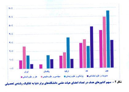 همچنین با بررسی های صورت گرفته، ایران ۵/۱ درصد از اعضای هیات علمی دانشگاه های برتر دنیا را در اختیار دارد. در میان کشورهای هدف، چین با سهم ۱/۵ درصدی از اعضای هیات علمی دانشگاه های برتر دنیا در جایگاه اول قرار دارد و سپس کشورهای هند، ترکیه، ایران و پاکستان به ترتیب در جایگاه های بعدی قرار گرفته اند. (شکل 2)